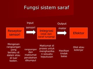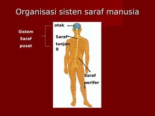 Sistem Saraf Pada Manusia Lengkap Admin. Koordinasi memastikan setiap bahagian badan dikawal supaya dapat berfungsi secara harmoni dengan bahagian yang lain apabila menerima ransangan. Sedangkan sistem saraf tepi terdiri atas sistem saraf somatis dan sistem saraf otonom.