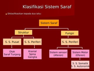 Sistem saraf bersama-sama dengan sistem hormon berfungsi untuk memelihara fungsi tubuh. Sistem saraf adalah suatu struktur yang terdiri dari komponen-komponen sel saraf neuron. Berdasarkan fungsinya dibedakan menjadi tiga yaitu.